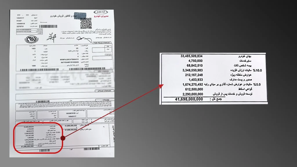 برای روشن شدن موضوع، نگاهی به یک نمونه فاکتور رسمی خودرو بیندازیم. در فاکتور یک خودروی مونتاژی مانند تیگو 8 پرومکس یا Xtreme VX، معمولاً موارد زیر دیده میشود: